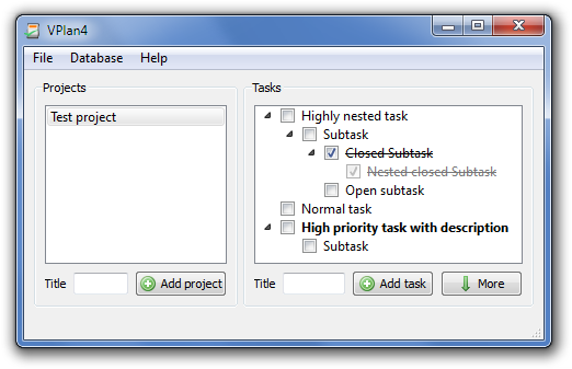 VPlan4 is the 4th version of a small todo planer I use. It’s designed to support the workflow from David Allen’s “Getting things done book”, and is tuned for high usability. It features a small memory footprint, loads very quickly and uses a robust database backend (in fact, all operations are ACID compliant. No data loss or corruption can occur, even if the computer crashes during a drag & drop operation.)