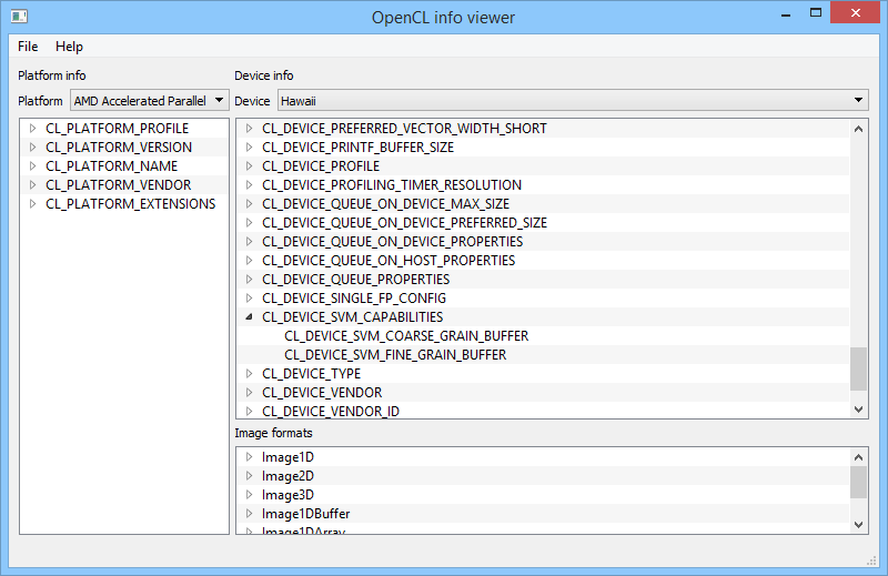 clInfo is a small tool to obtain information about OpenCL support. It will gather information about all devices from all platforms. The code generates an in-memory property tree, which can be also easily exported as it consists of C data structures – making this tool perfect for embedding into other projects.